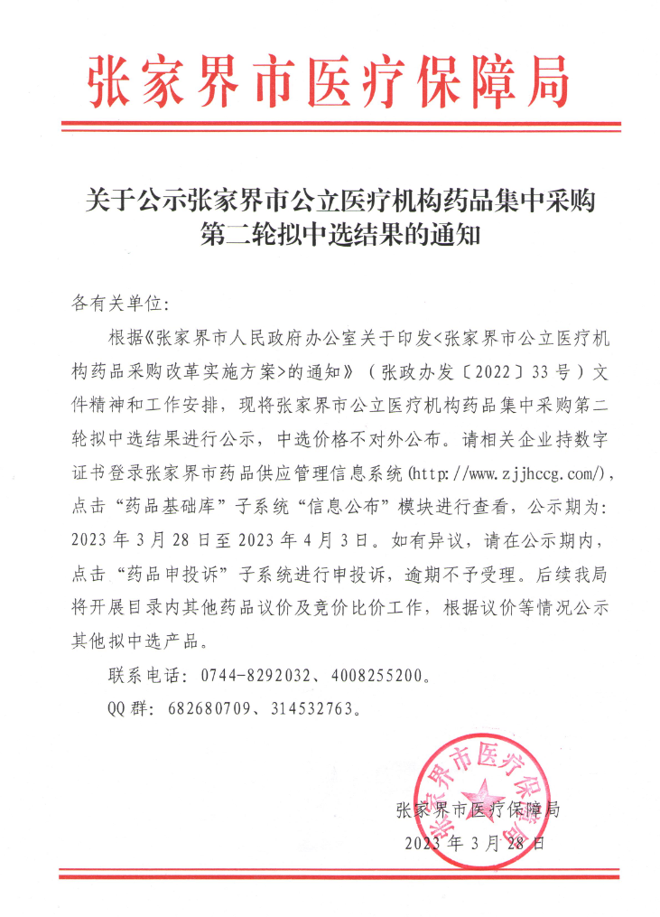 根据《张家界市人民政府办公室关于印发<张家界市公立医疗机构药品采购改革实施方案>的通知》(张政办发〔2022〕33号)文件精神和工作安排,现将张家界市公立医疗机构药品集中采购第二轮拟中选结果进行公示,中选价格不对外公布。请相关企业持数字证书登录张家界市药品供应管理信息系统(http://ww.zjjhccg.com/),点击“药品基础库”子系统“信息公布”模块进行查看,公示期为:2023年3月28日至2023年4月3日。如有异议,请在公示期内,点击“药品申投诉”子系统进行申投诉,逾期不予受理。后续我局将开展目录内其他药品议价及竞价比价工作,根据议价等情况公示其他拟中选产品。