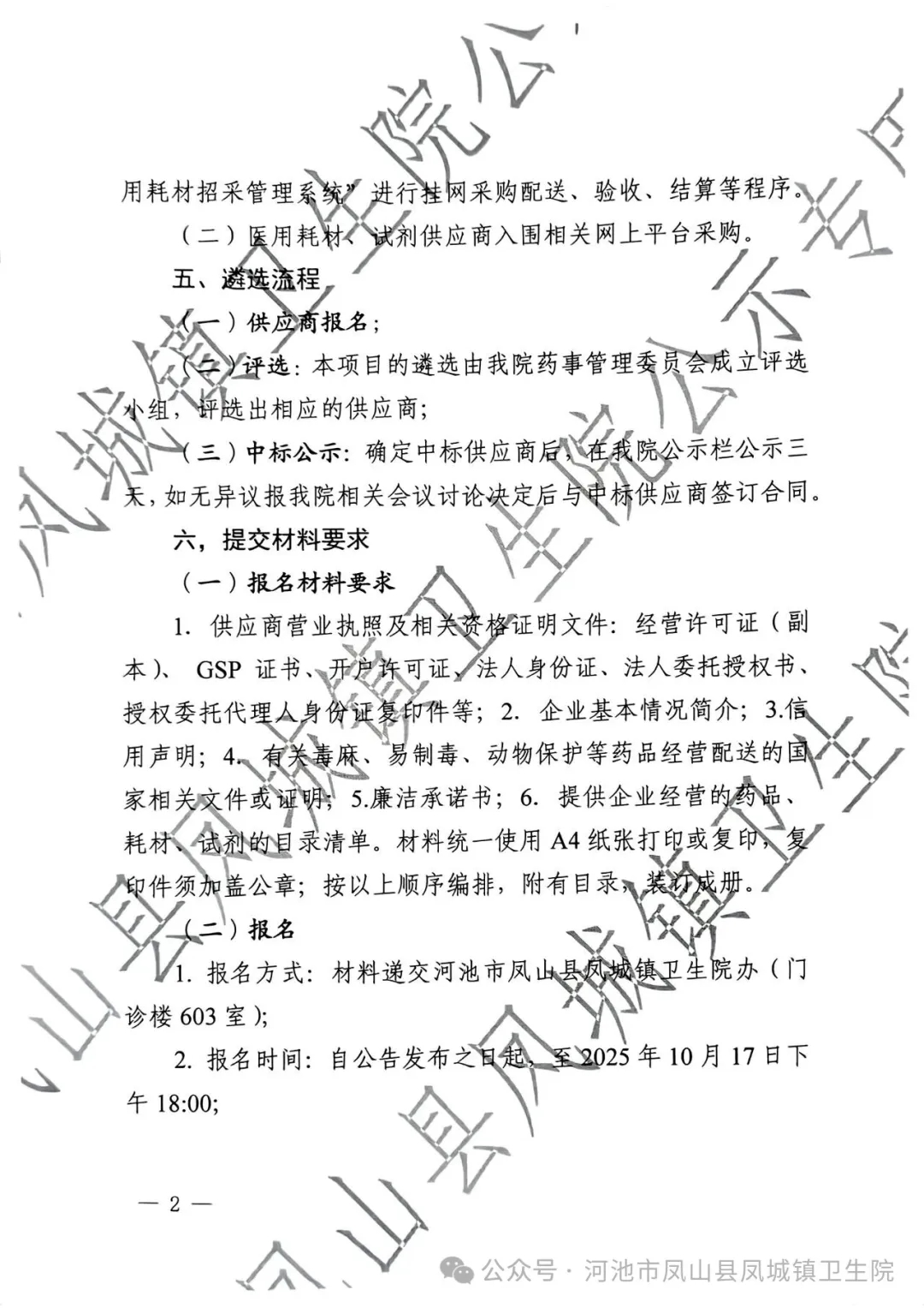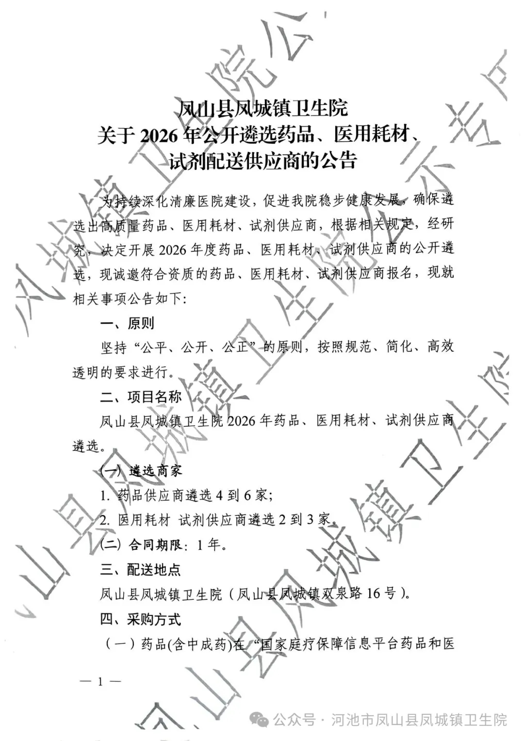 【河池市凤山县凤城镇卫生院】广西壮族自治区河池市凤山县凤城镇卫生院关于2026年公开遴选药品、医用耗材、试剂配送供应商的公告