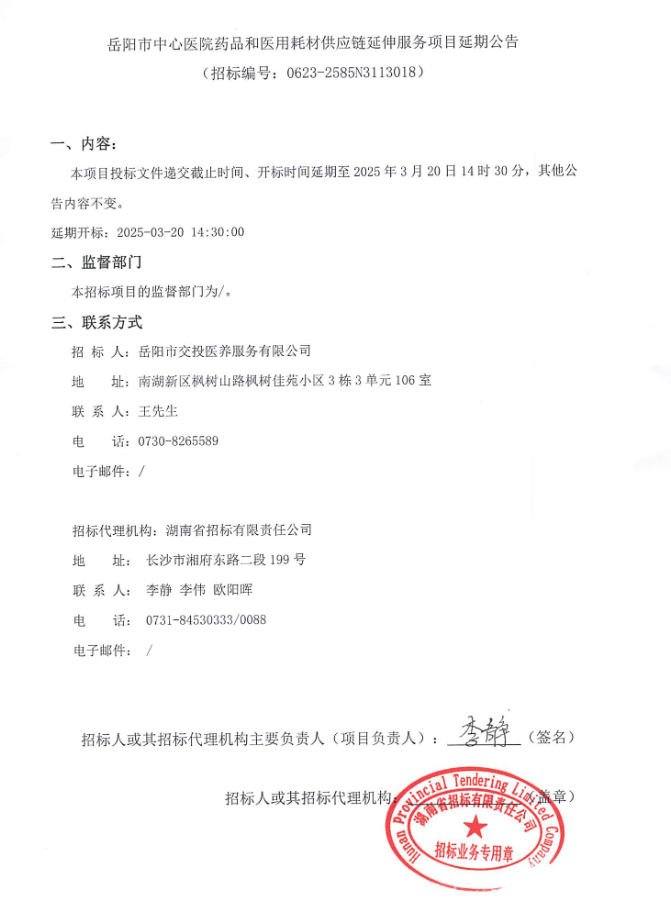 【岳阳市中心医院】湖南省岳阳市中心医院药品和医用耗材供应链延伸服务项目延期公告