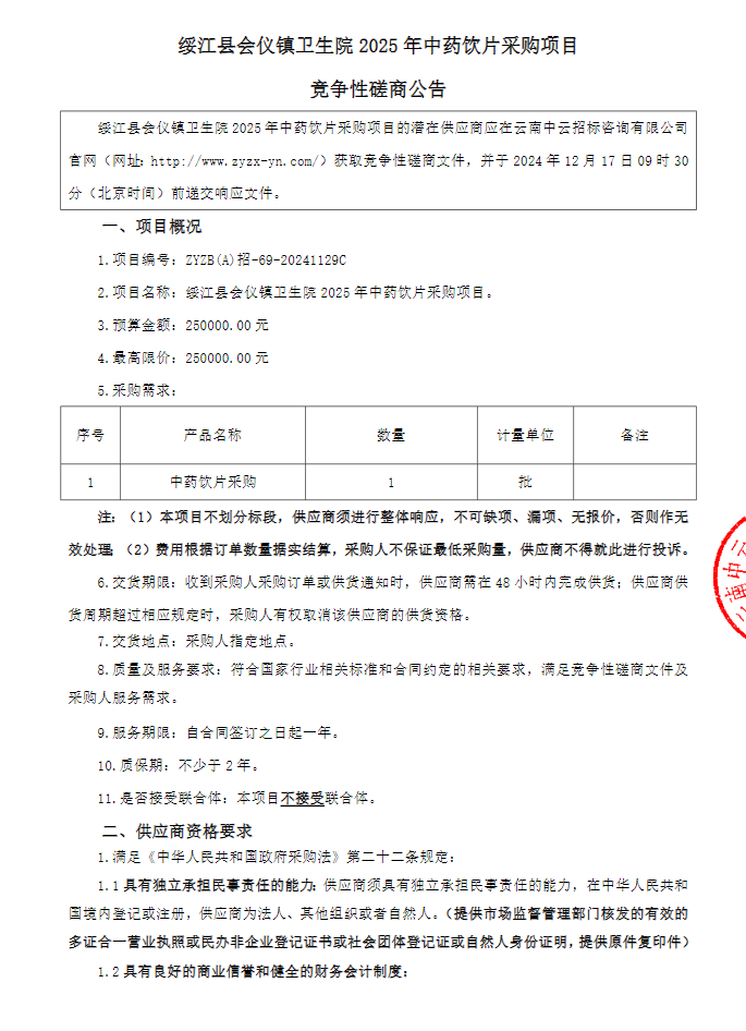 【昭通市绥江县会仪镇卫生院】云南省昭通市绥江县会仪镇卫生院2025年中药饮片采购项目竞争性磋商公告