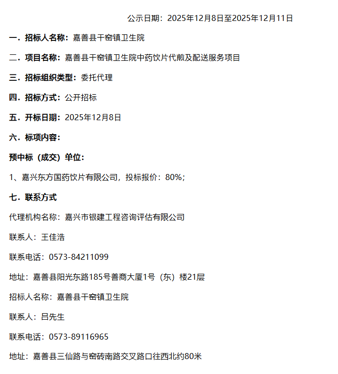 【嘉兴市嘉善县干窑镇卫生院】浙江省嘉兴市嘉善县干窑镇卫生院中药饮片代煎及配送服务项目-预中标(成交)公示