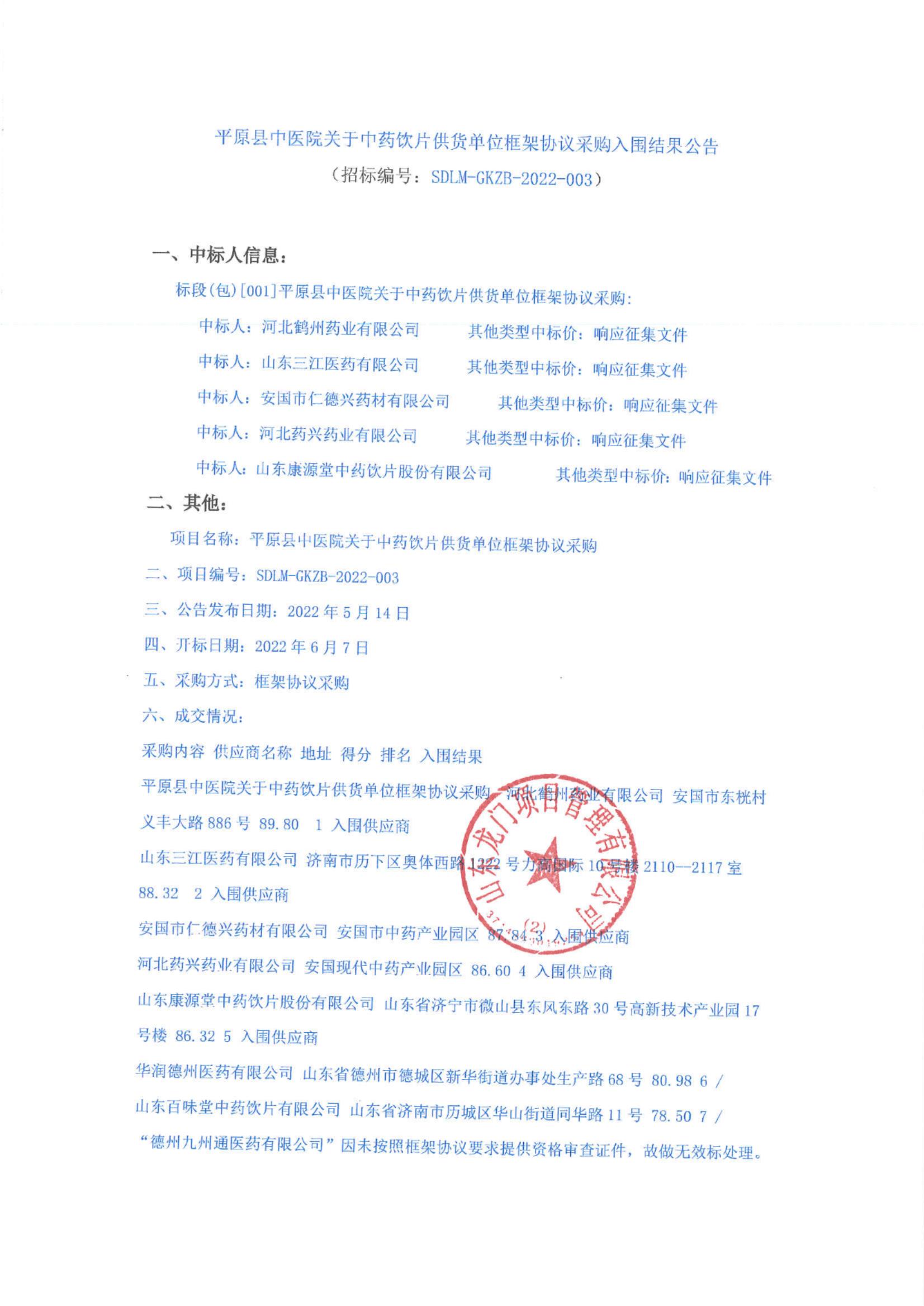 【平原县中医院】平原县中医院关于中药饮片供货单位框架协议采购入围结果公告