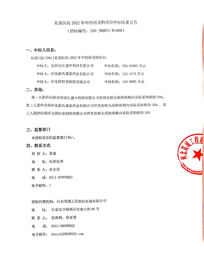 【石家庄市某部医院】河北省石家庄市某部医院2022年中药材采购项目中标结果公告