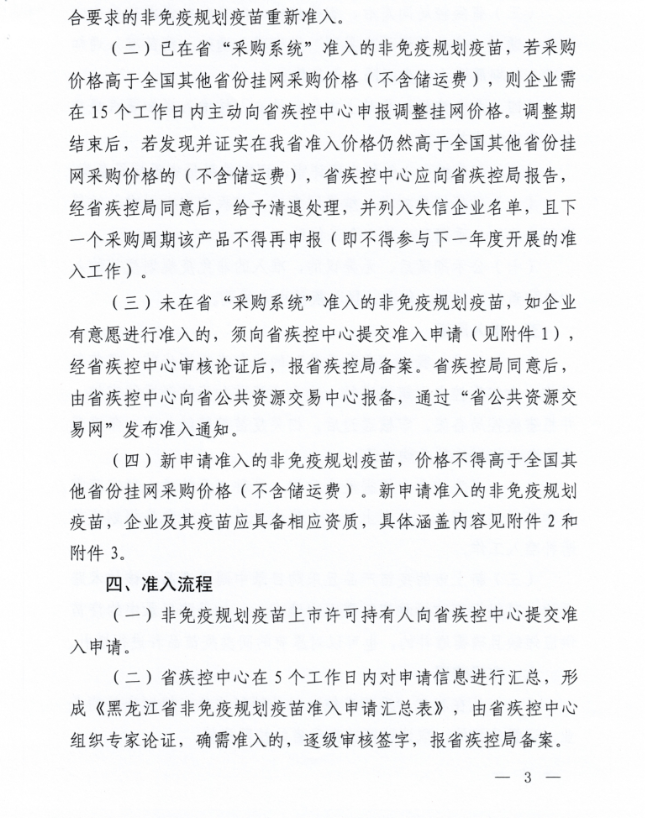 (四)新申请准入的非免疫规划疫苗,价格不得高于全国其他省份挂网采购价格(不含储运费)。新申请准入的非免疫规划疫苗,企业及其疫苗应具备相应资质,具体涵盖内容见附件2和附件3。
