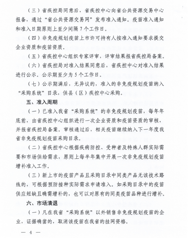 (三)未在省“采购系统”准入的非免疫规划疫苗,如企业有意愿进行准入的,须向省疾控中心提交准入申请(见附件1),经省疾控中心审核论证后,报省疾控局备案。省疾控局同意后,由省疾控中心向省公共资源交易中心报备,通过“省公共资源交易网”发布准入通知。