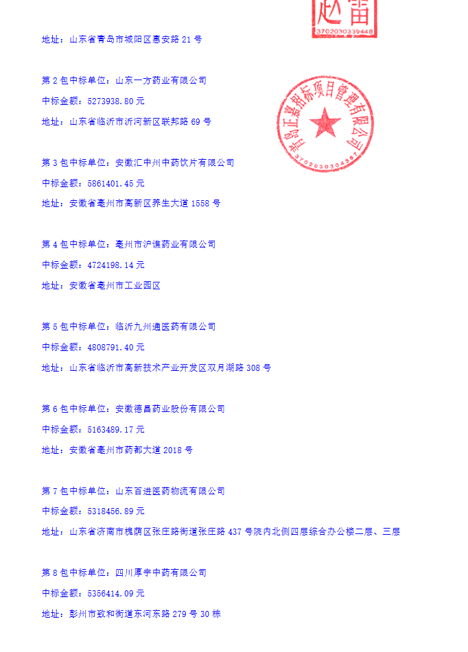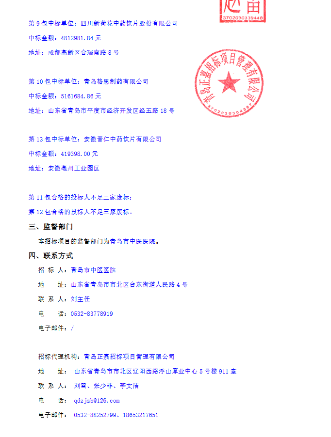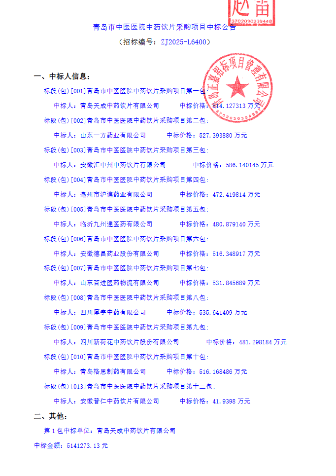 【青岛市中医医院】山东省青岛市中医医院中药饮片采购项目中标公告