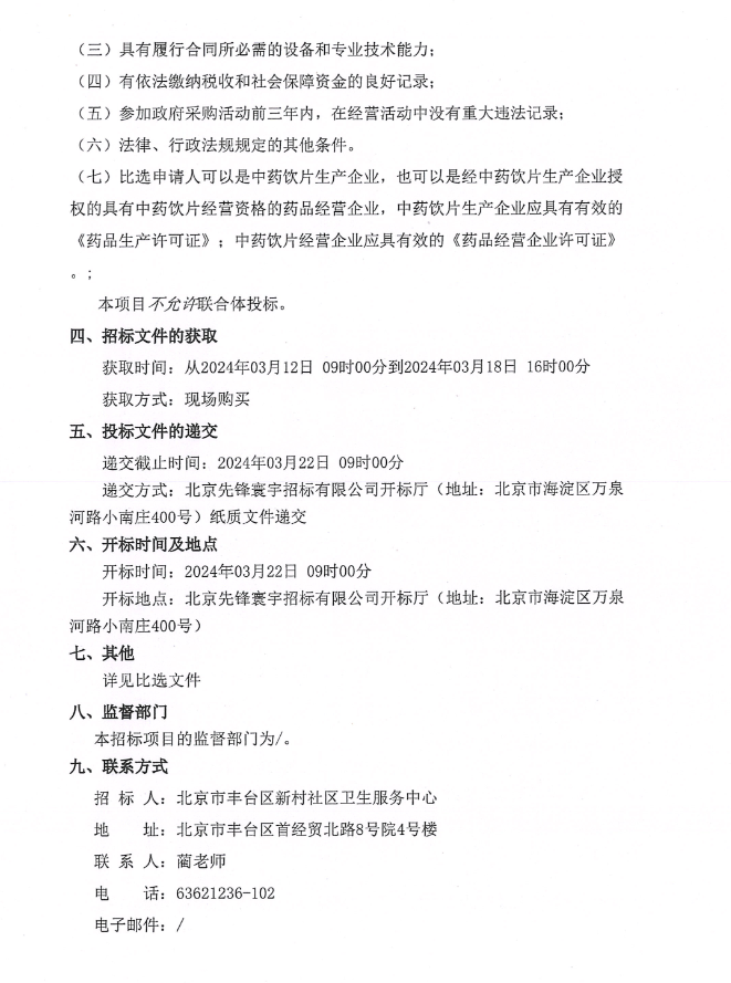 【北京市丰台区新村社区卫生服务中心】北京市丰台区新村社区卫生服务中心中药饮片及代煎服务项目比选公告(20240312)