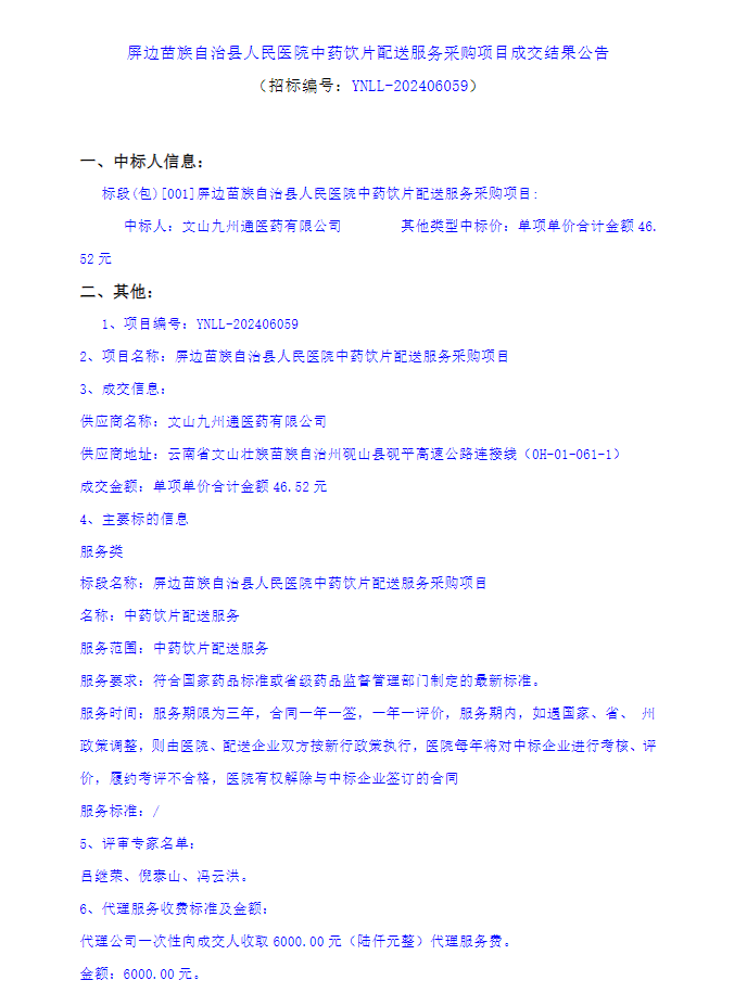 【红河哈尼族彝族自治州屏边苗族自治县人民医院】云南省红河哈尼族彝族自治州屏边苗族自治县人民医院中药饮片配送服务采购项目成交结果公告