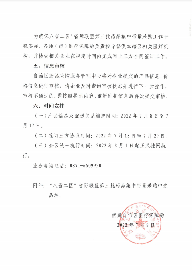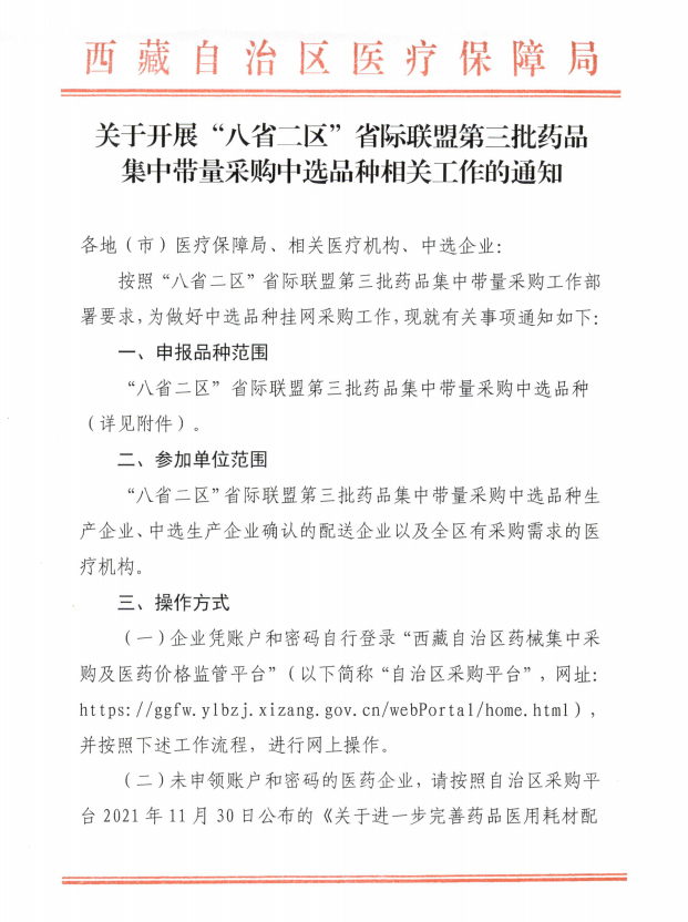 【西藏】关于开展“八省二区”省际联盟第三批药品集中带量采购中选品种相关工作的通知