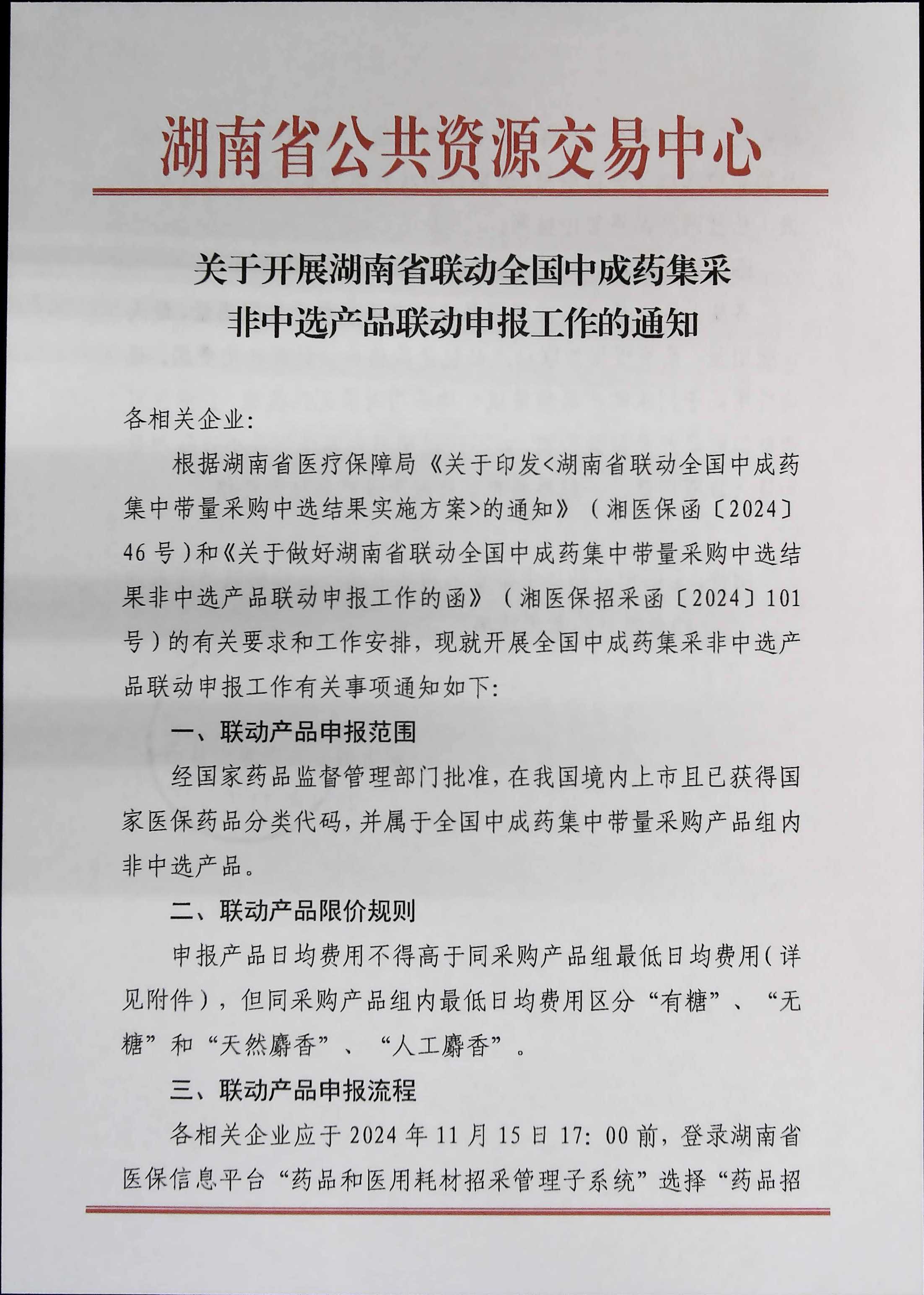 根据湖南省医疗保障局《关于印发<湖南省联动全国中成药集中带量采购中选结果实施方案>的通知》(湘医保函〔2024〕46号)和《关于做好湖南省联动全国中成药集中带量采购中选结果非中选产品联动申报工作的函》(湘医保招采函〔2024〕101号)的有关要求和工作安排,现就开展全国中成药集采非中选产品联动申报工作有关事项通知如下: