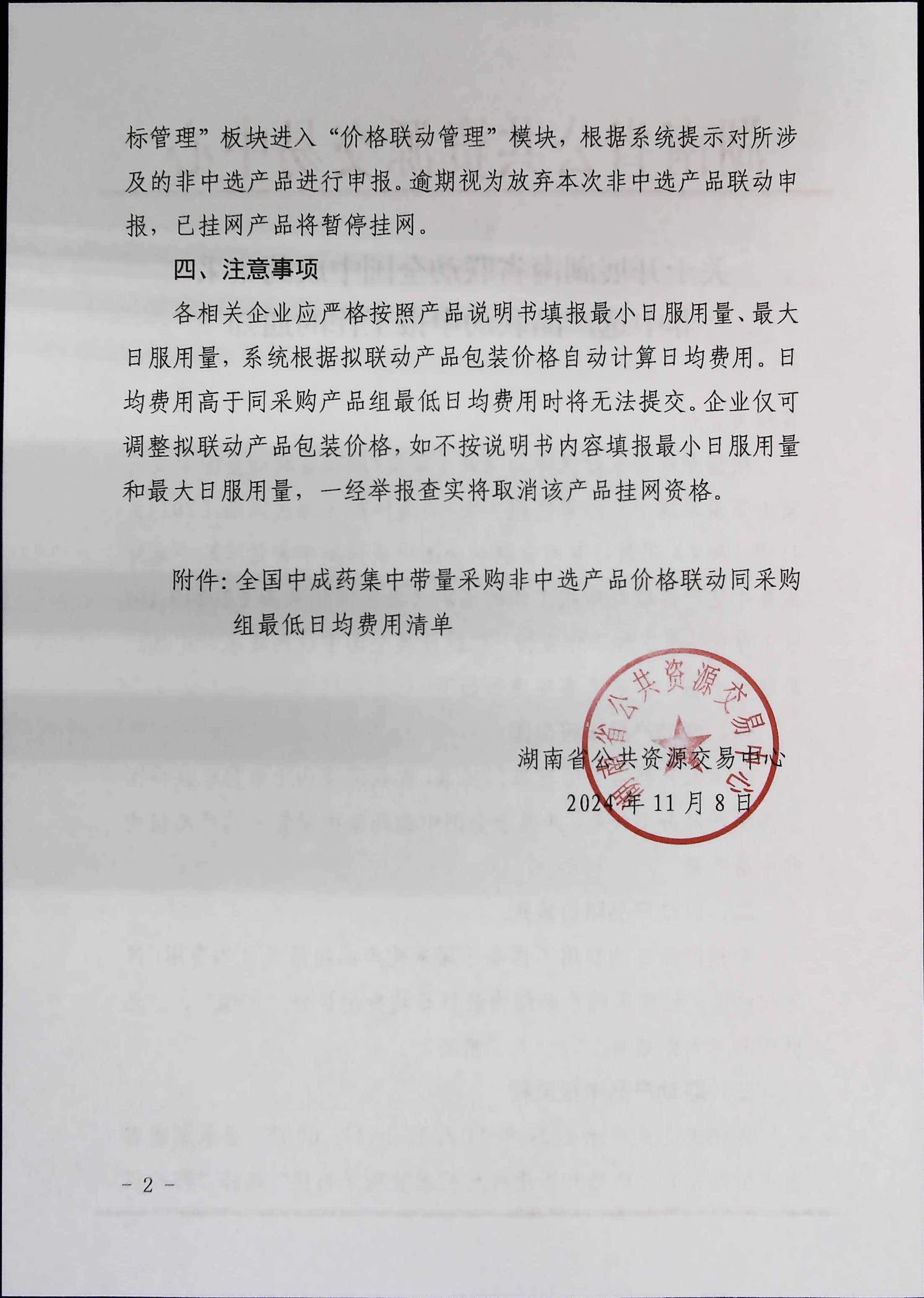 各相关企业应于2024年11月15日17:00前,登录湖南省医保信息平台“药品和医用耗材招采管理子系统”选择“药品招标管理”板块进入“价格联动管理”模块,根据系统提示对所涉及的非中选产品进行申报。逾期视为放弃本次非中选产品联动申报,已挂网产品将暂停挂网。
