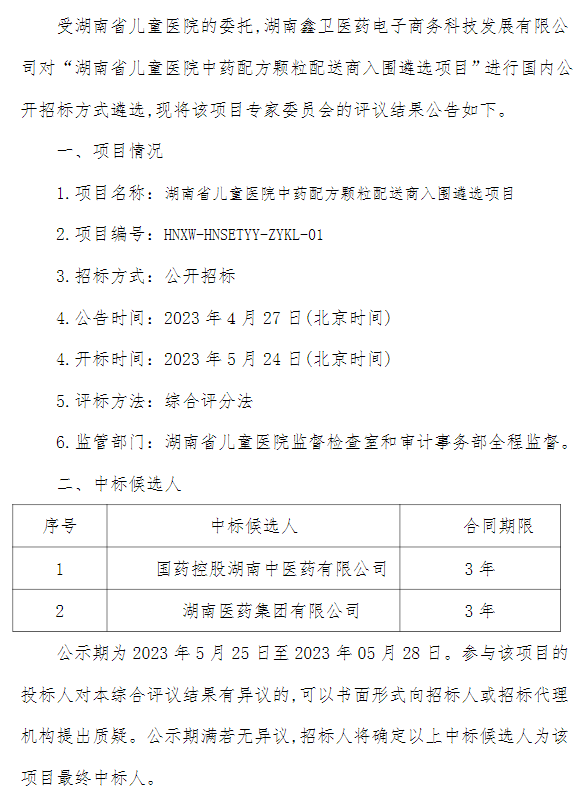 【湖南省儿童医院】湖南省儿童医院中药配方颗粒配送商入围遴选项目中标公示