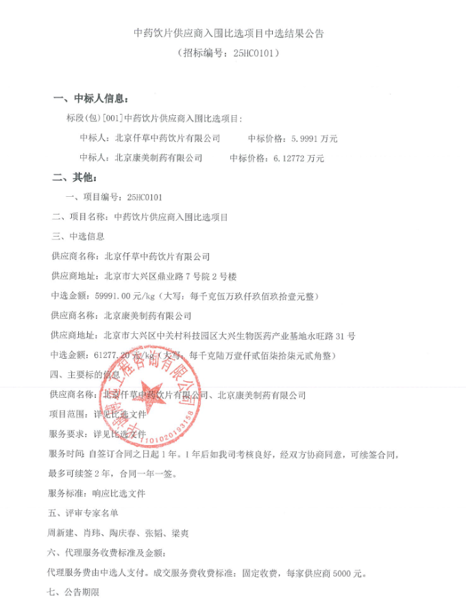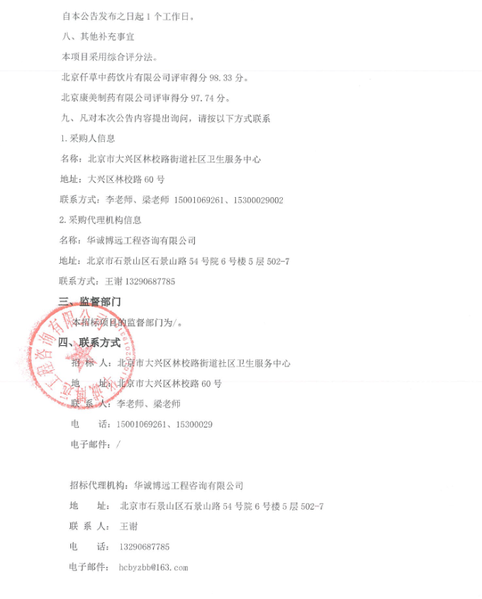 【北京市大兴区林校路街道社区卫生服务中心】北京市大兴区林校路街道社区卫生服务中心中药饮片供应商入围比选项目中选结果公告