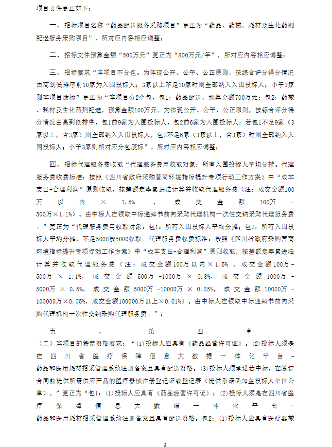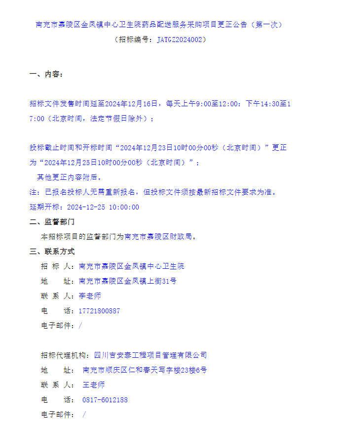 【南充市嘉陵区金凤镇中心卫生院】四川省南充市嘉陵区金凤镇中心卫生院药品配送服务采购项目更正公告(第一次)