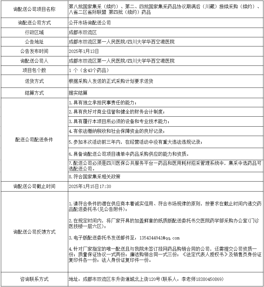 【四川大学华西空港医院】四川大学华西空港医院关于部分集采药品的询配送公司公告