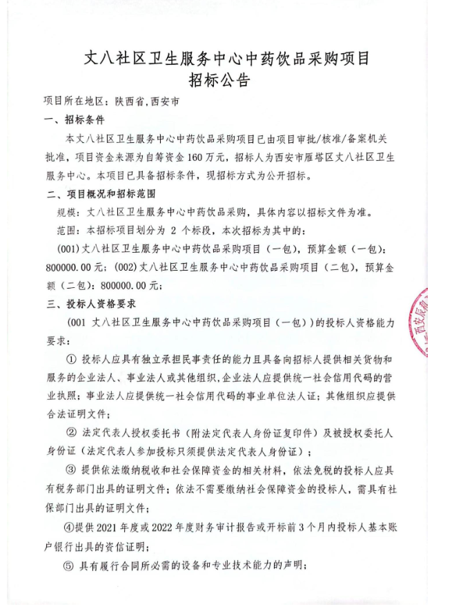 【西安市雁塔区丈八社区卫生服务中心】陕西省西安市雁塔区丈八社区卫生服务中心中药饮品采购项目公开招标公告