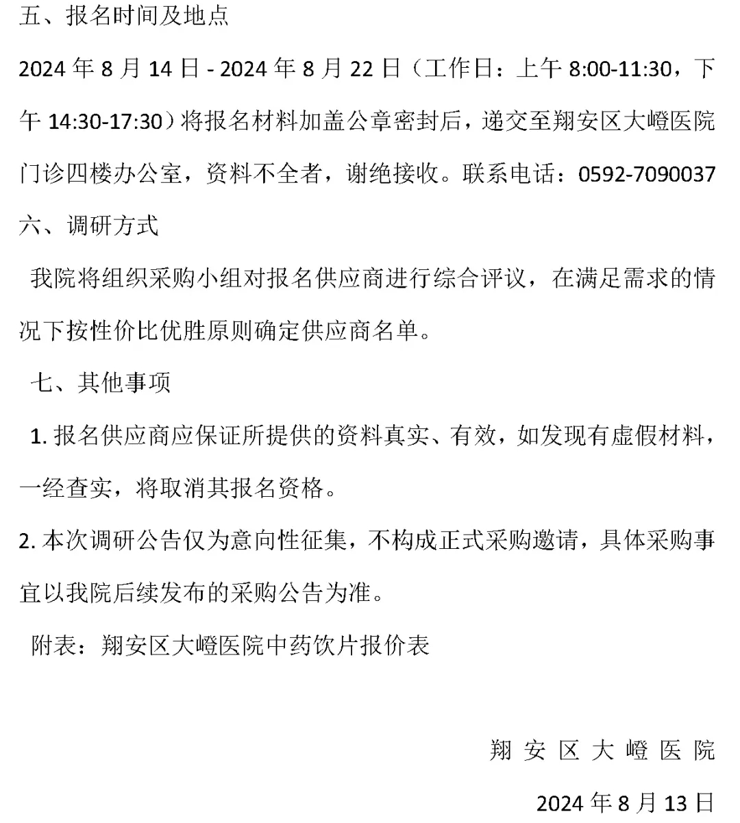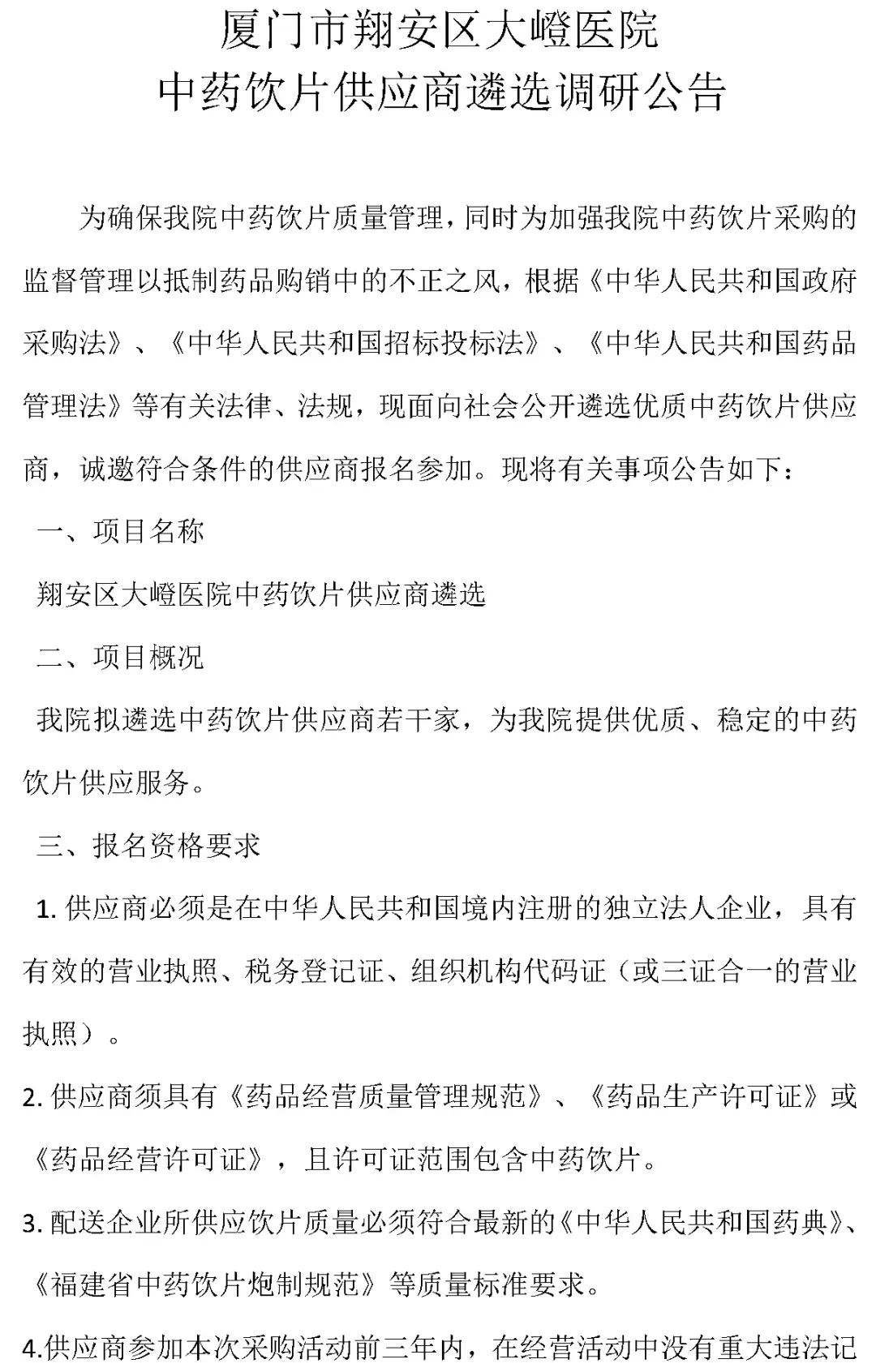 【厦门市翔安区大嶝医院】福建省厦门市翔安区大嶝医院中药饮片供应商遴选公告