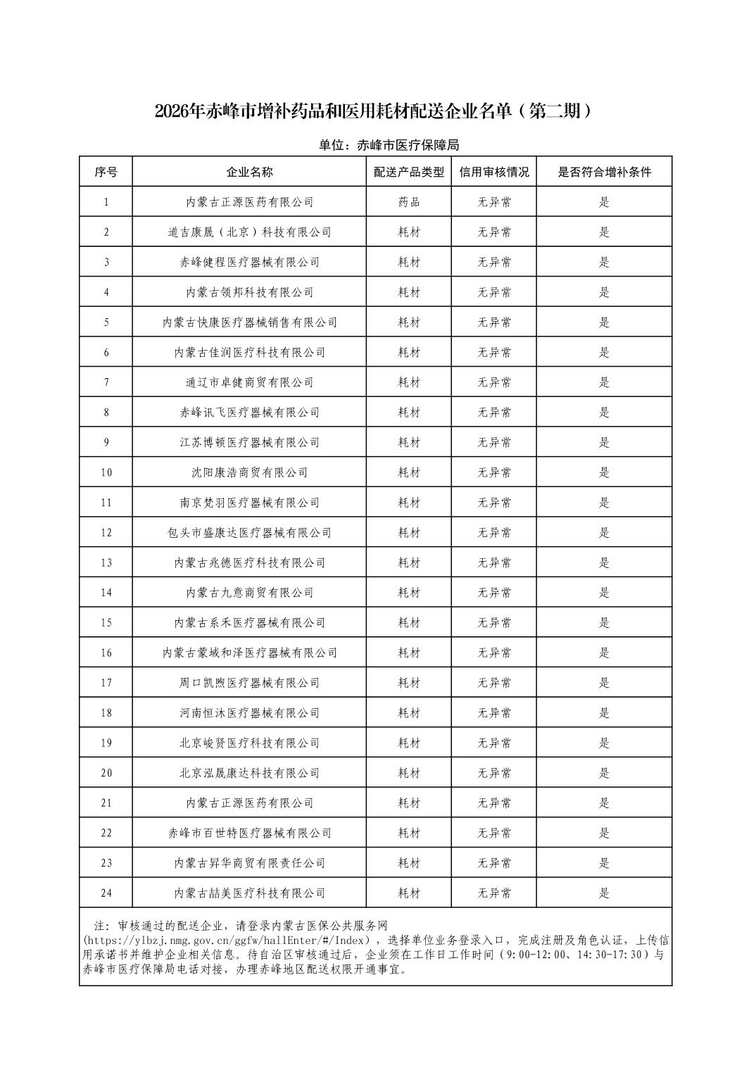 【赤峰】2026年赤峰市增补药品和医用耗材配送企业名单(第二期)