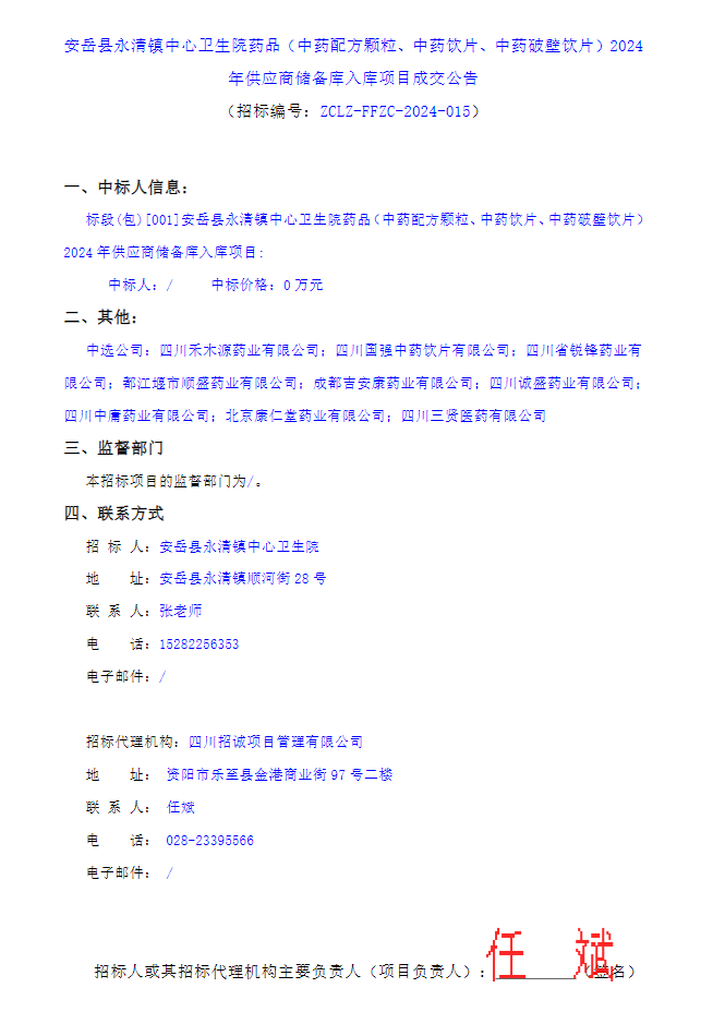 【资阳市安岳县永清镇中心卫生院】四川省资阳市安岳县永清镇中心卫生院药品(中药配方颗粒、中药饮片、中药破壁饮片)2024年供应商储备库入库项目成交公告