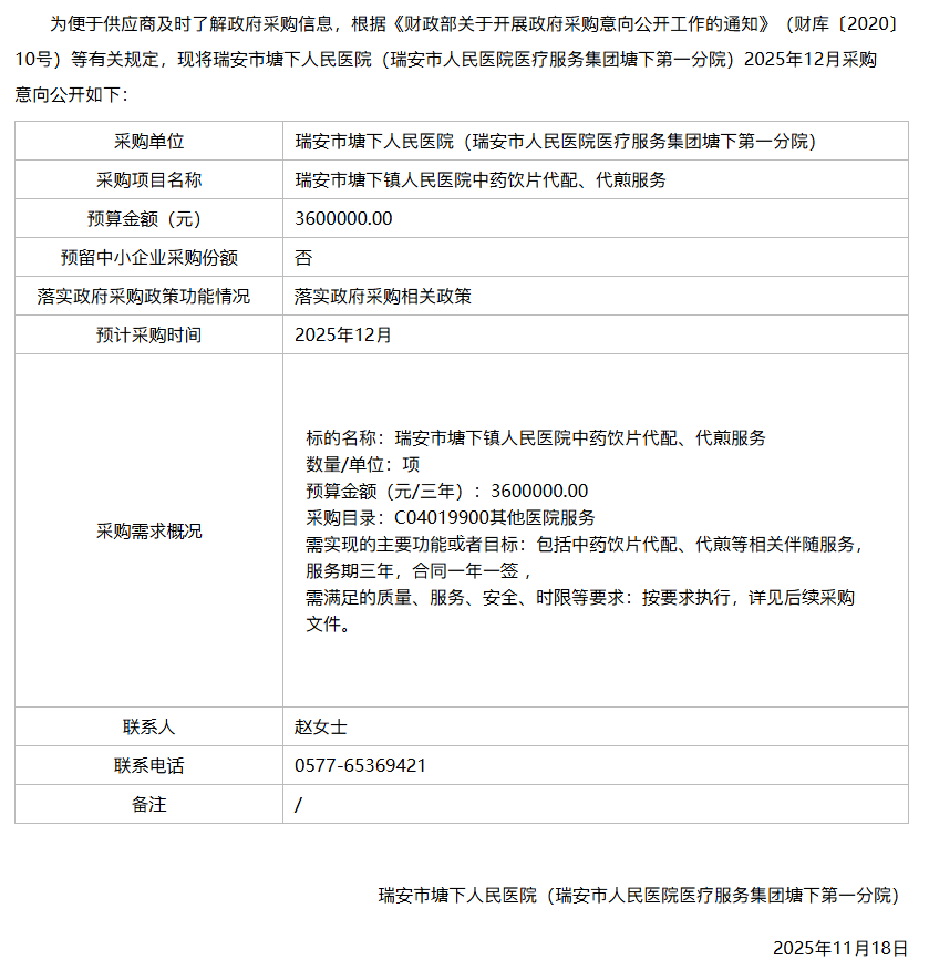 【温州市瑞安市塘下人民医院】浙江省温州市瑞安市塘下人民医院(瑞安市人民医院医疗服务集团塘下第一分院)2025年12月政府采购意向1