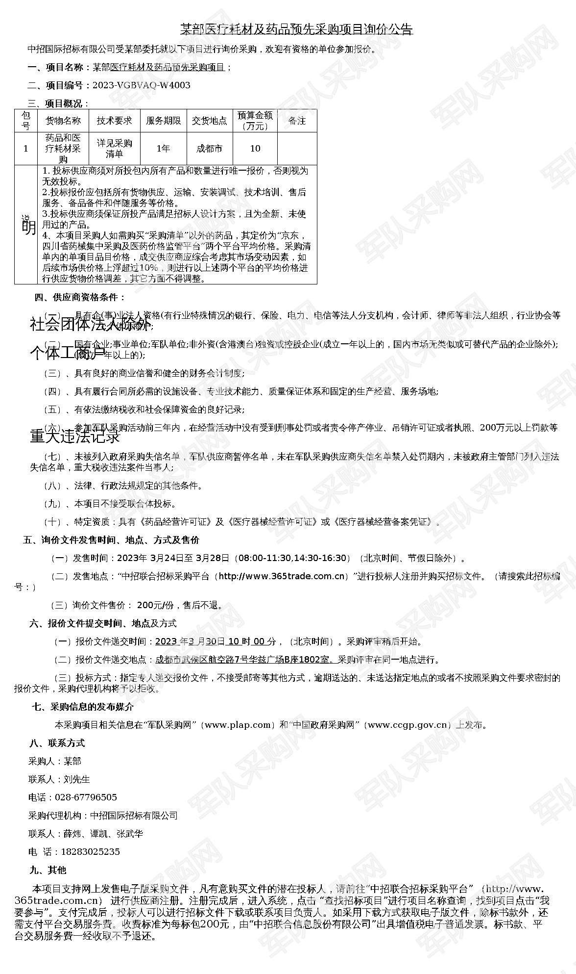 【军队采购】军队采购网某部医疗耗材及药品预先采购项目询价公告(2023-VGBVAQ-W4003)