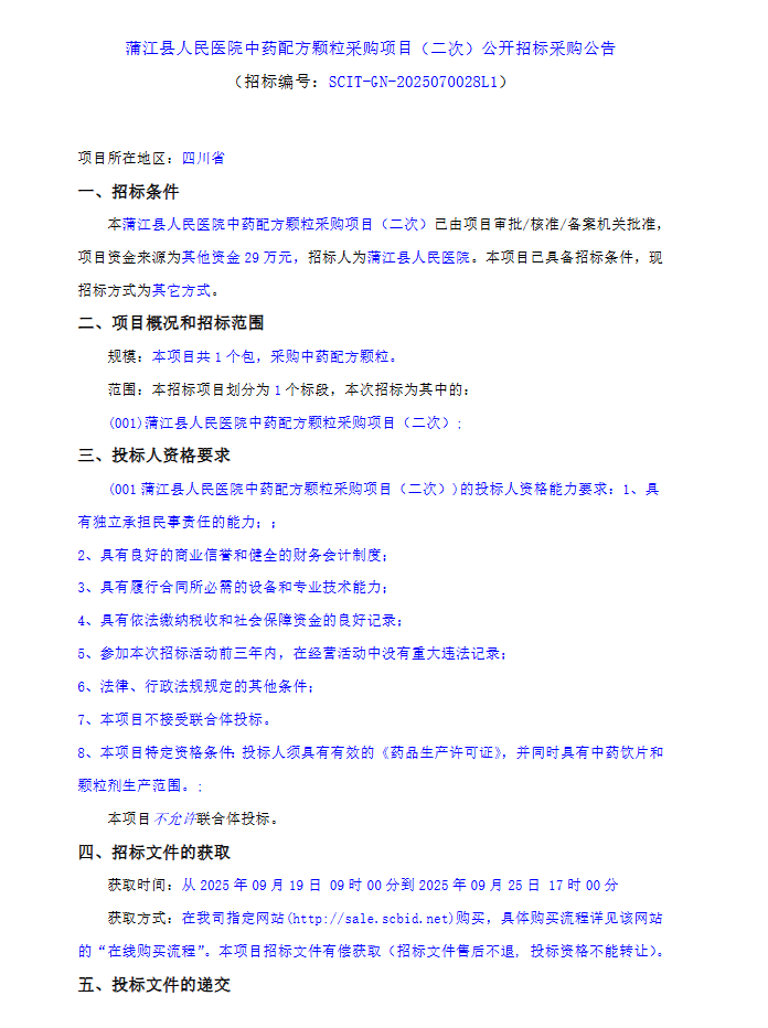 【成都市蒲江县人民医院】四川省成都市蒲江县人民医院中药配方颗粒采购项目(二次)公开招标采购公告