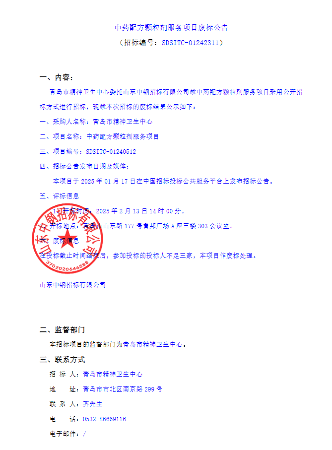 【青岛市精神卫生中心】山东省青岛市精神卫生中心中药配方颗粒剂服务项目废标公告