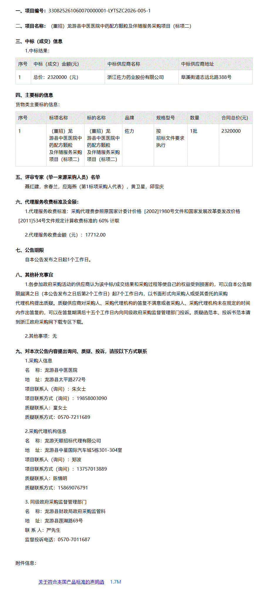 【衢州市龙游县中医医院】浙江省龙游天顺招标代理有限公司关于(重招)龙游县中医医院中药配方颗粒及伴随服务采购项目(标项二)中标(成交)结果公告