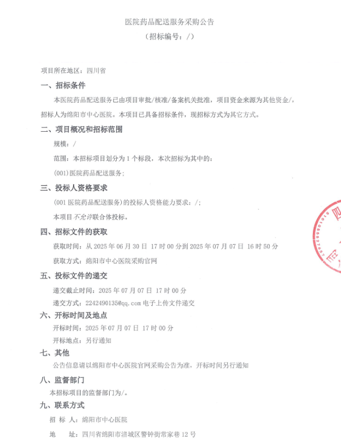【绵阳市中心医院】四川省绵阳市中心医院医院药品配送服务采购公告