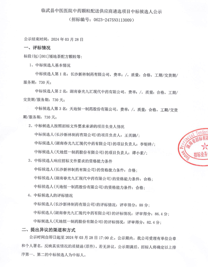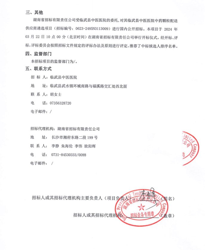 【郴州市临武县中医医院】湖南省郴州市临武县中医医院中药颗粒配送供应商遴选项目中标候选人公示