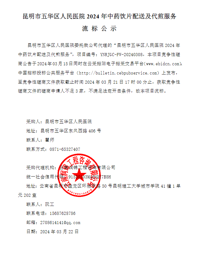 【昆明市五华区人民医院】云南省昆明市五华区人民医院2024年中药饮片配送及代煎服务流标公示