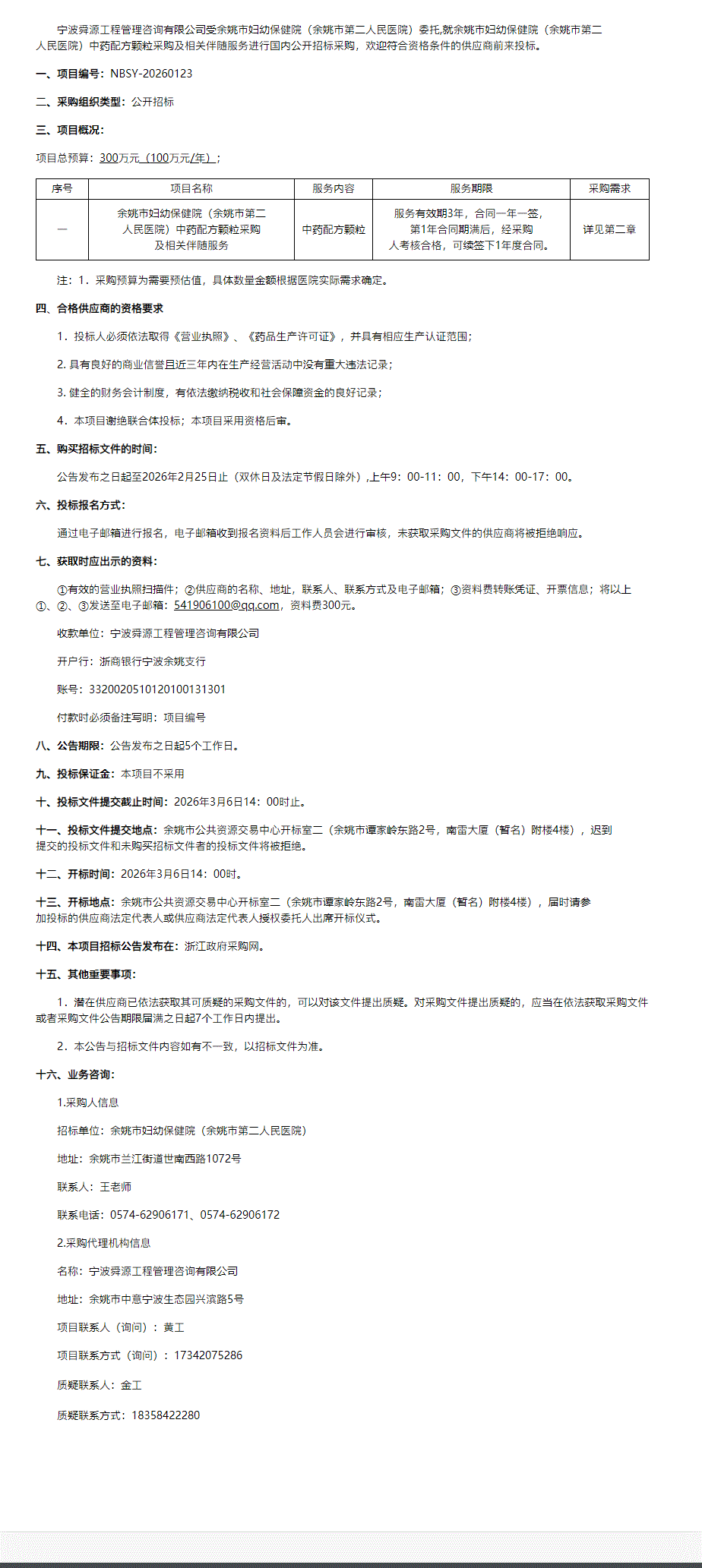 【宁波市余姚市妇幼保健院】浙江省余姚市妇幼保健院(余姚市第二人民医院)中药配方颗粒采购及相关伴随服务采购公告(非政府采购项目)