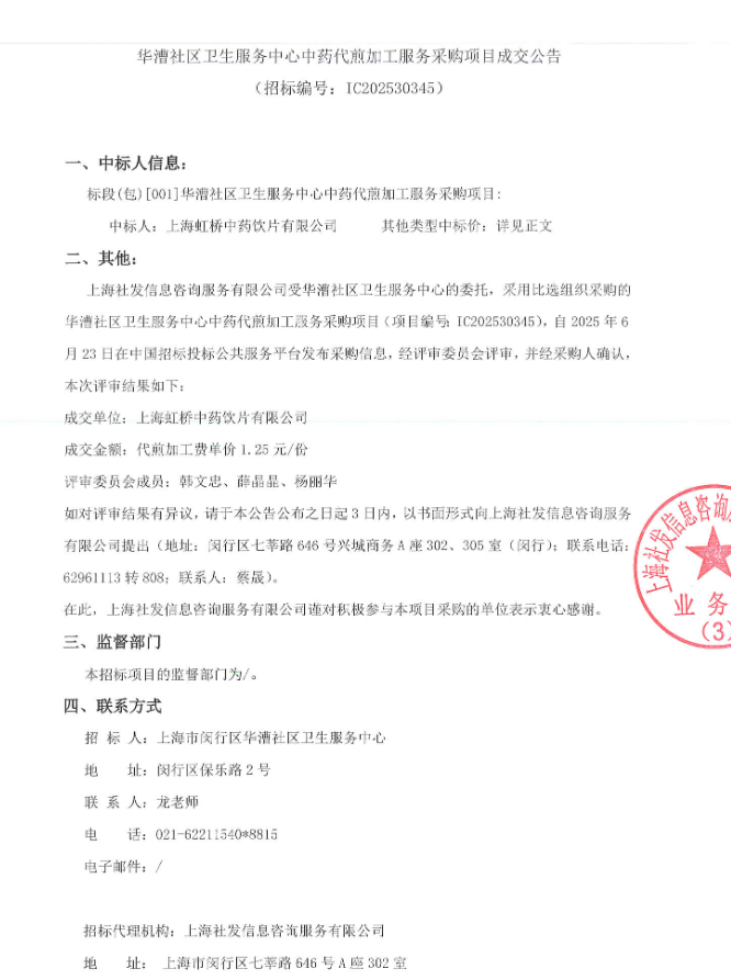 【上海市闵行区华漕社区卫生服务中心】上海市闵行区华漕社区卫生服务中心中药代煎加工服务采购项目成交公告