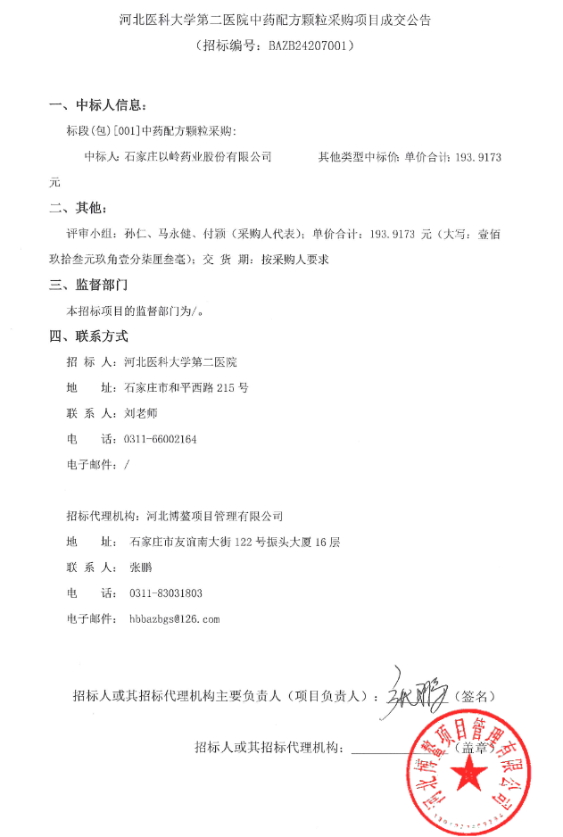 【河北医科大学第二医院】河北医科大学第二医院中药配方颗粒采购项目成交公告