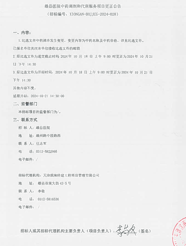 【保定市雄县医院】河北省保定市雄县医院中药调剂和代煎服务项目更正公告