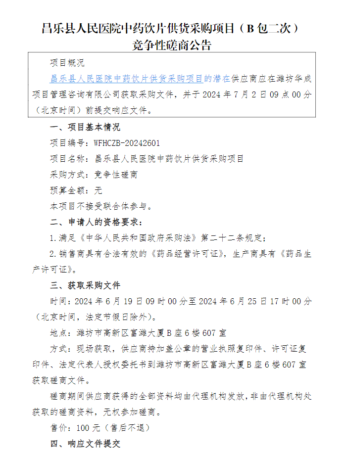【潍坊市昌乐县人民医院】山东省潍坊市昌乐县人民医院中药饮片供货采购项目(B包二次)竞争性磋商公告