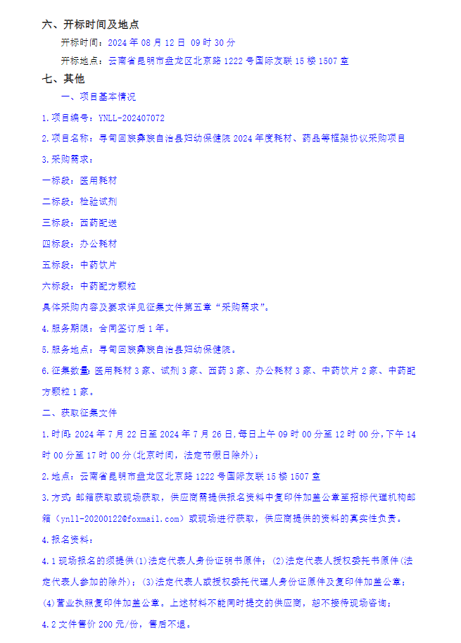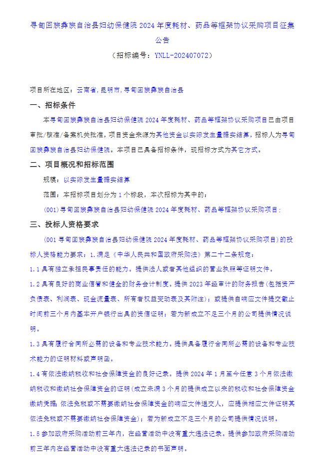 【昆明市寻甸回族彝族自治县妇幼保健院】云南省昆明市寻甸回族彝族自治县妇幼保健院2024年度耗材、药品等框架协议采购项目征集公告