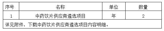 根据医院业务发展需求,近期拟对中药饮片供应商遴选项目进行院内市场调查,现面向社会公告,欢迎有意向、资质合格的供应商前来参加市场调查。