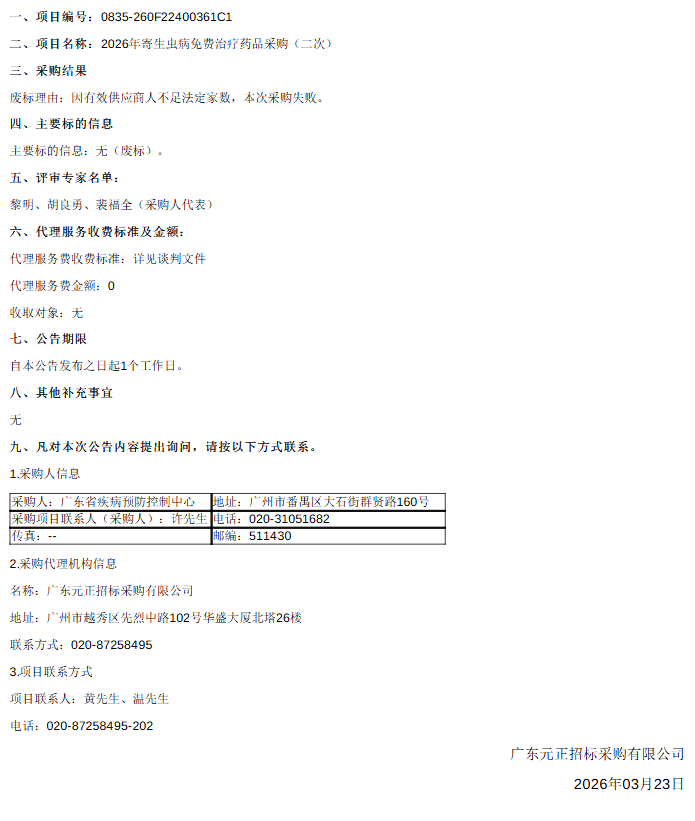 【广东省疾病预防控制中心】广东省疾病预防控制中心2026年寄生虫病免费治疗药品采购(二次)(项目编号:0835-260F22400361C1)废标公告