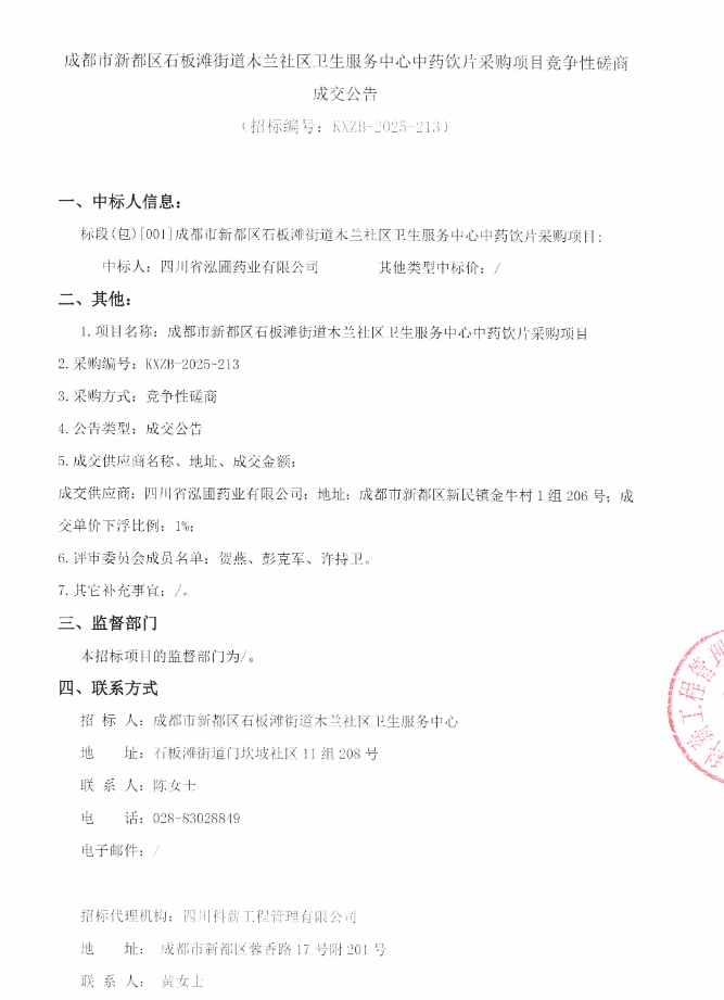 【成都市新都区石板滩街道木兰社区卫生服务中心】四川省成都市新都区石板滩街道木兰社区卫生服务中心中药饮片采购项目竞争性磋商成交公告