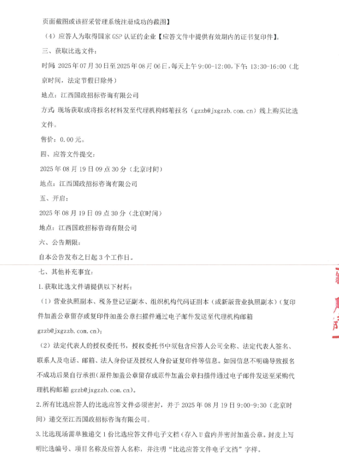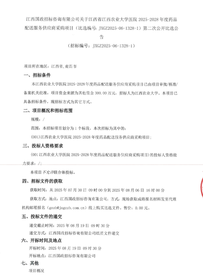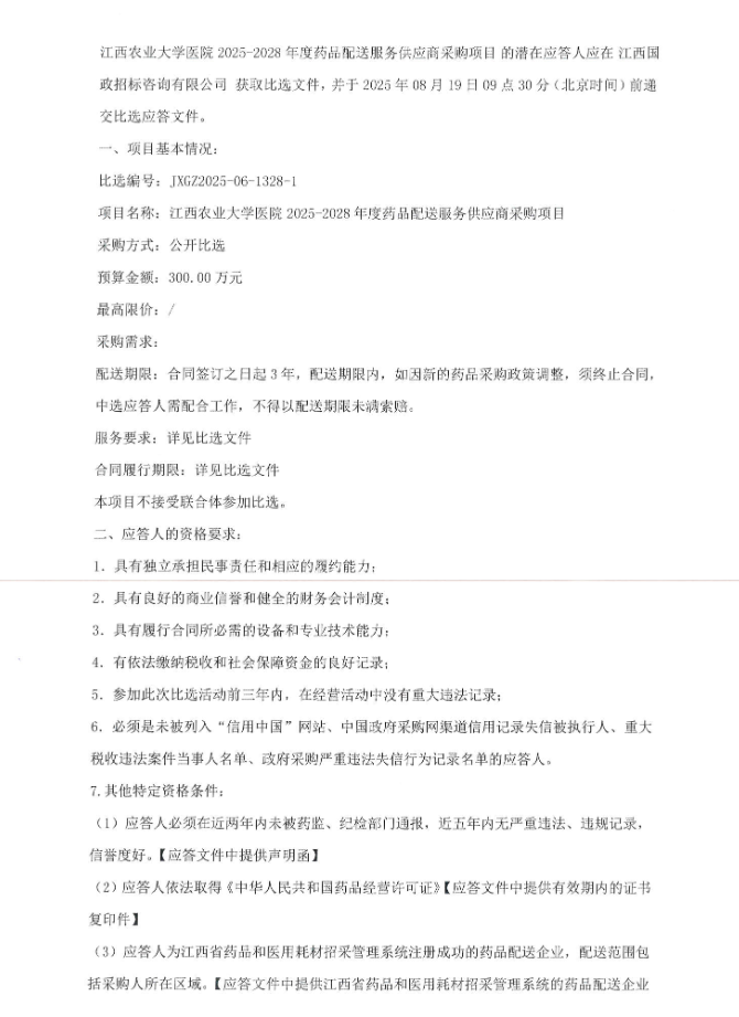 【江西农业大学】江西国政招标咨询有限公司关于江西省江西农业大学医院2025-2028年度药品配送服务供应商采购项目(比选编号:JXGZ2025-06-1328-1)第二次公开比选公告