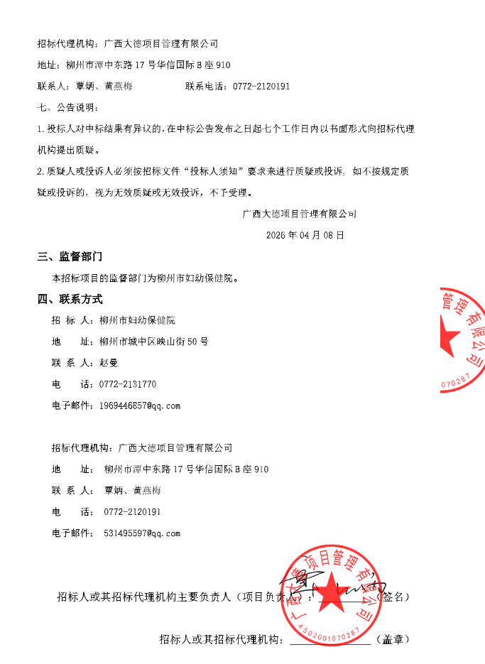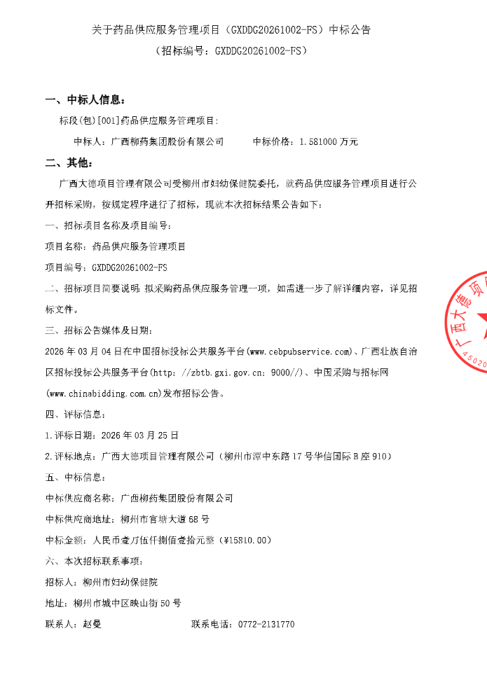 【柳州市妇幼保健院】广西壮族自治区柳州市妇幼保健院关于药品供应服务管理项目(GXDDG20261002-FS)中标公告