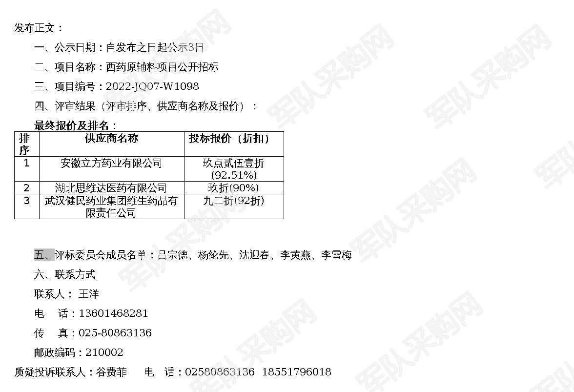 【军队采购】军队采购网西药原辅料项目公开招标结果公示(2022-JQ07-W1098)