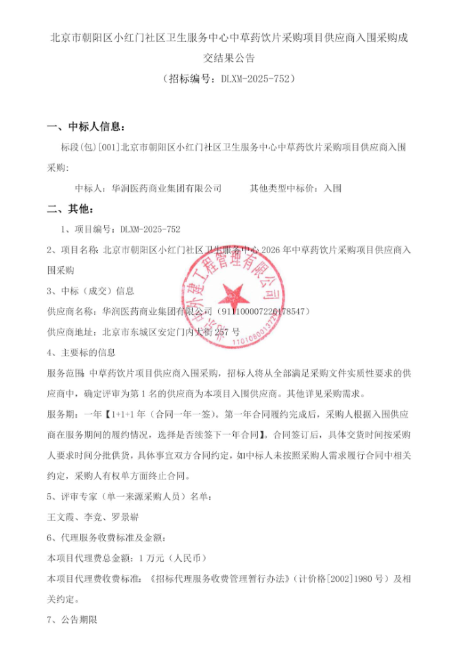 【北京市朝阳区小红门社区卫生服务中心】北京市朝阳区小红门社区卫生服务中心中草药饮片采购项目供应商入围采购成交结果公告