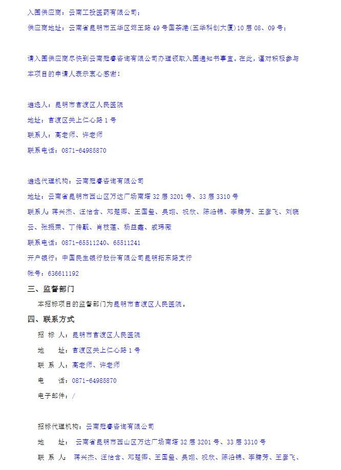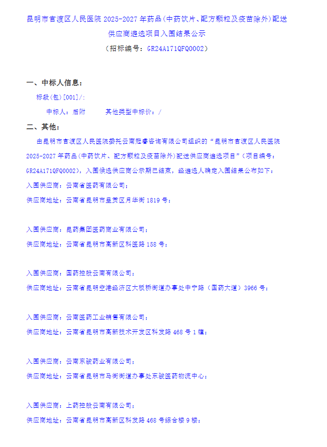 【昆明市官渡区人民医院】云南省昆明市官渡区人民医院2025-2027年药品(中药饮片、配方颗粒及疫苗除外)配送供应商遴选项目入围结果公示