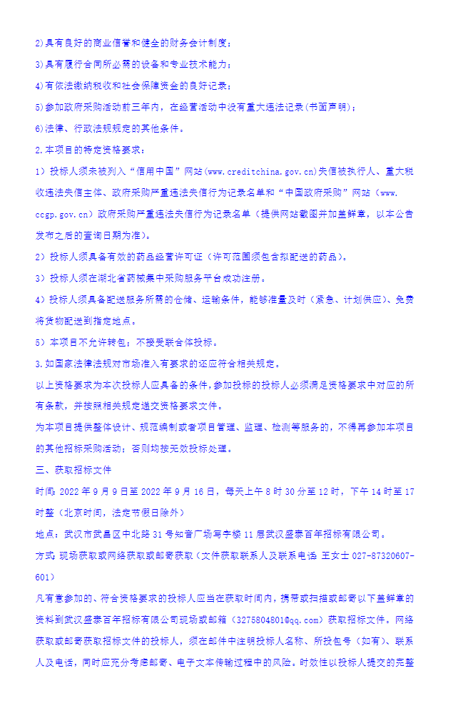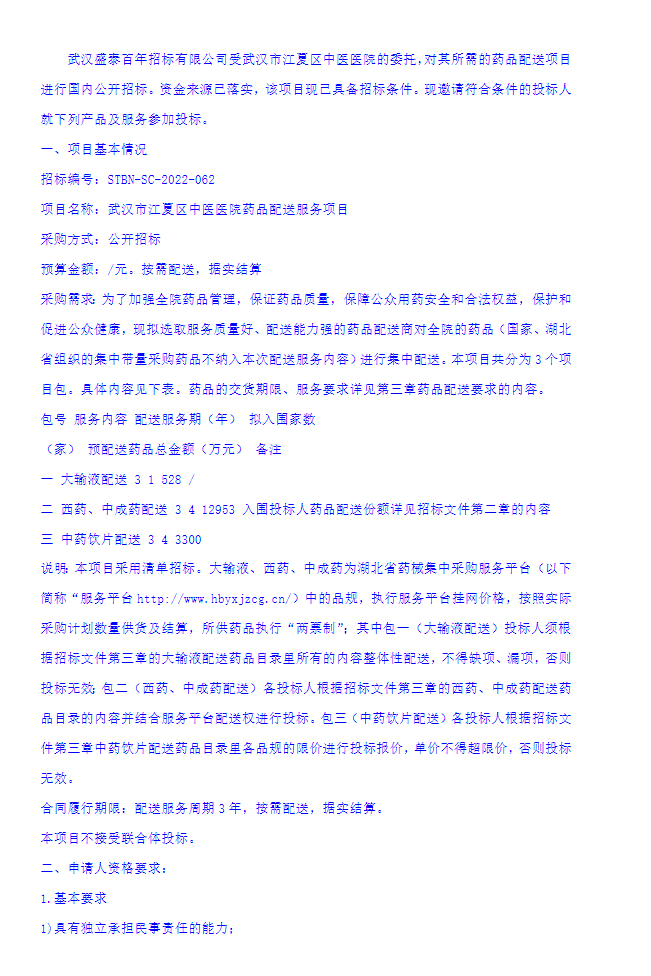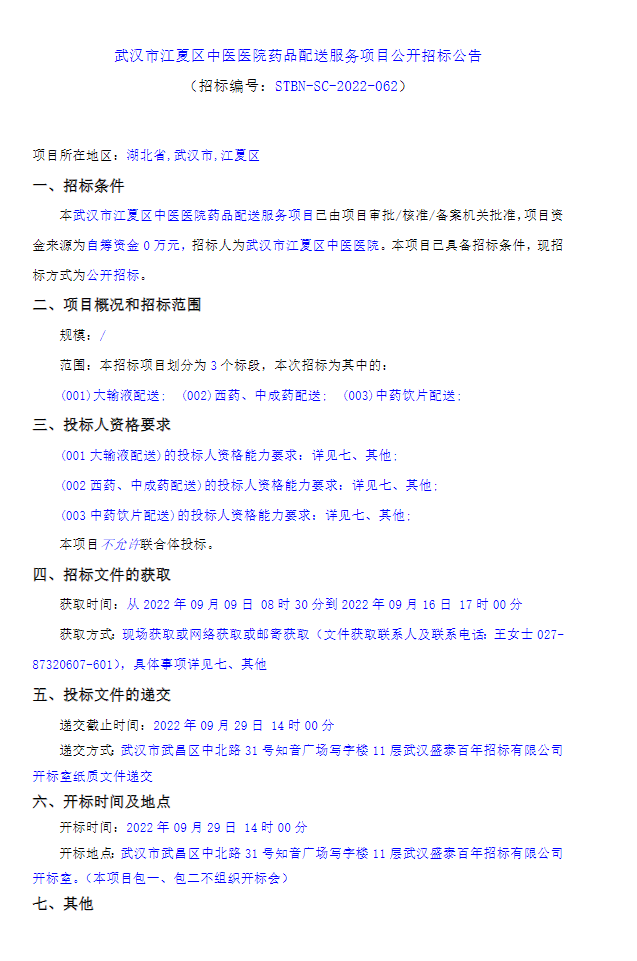 【湖北省武汉市江夏区中医医院】药品配送服务项目公开招标公告