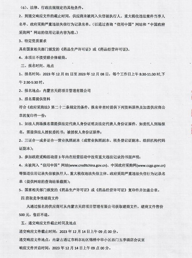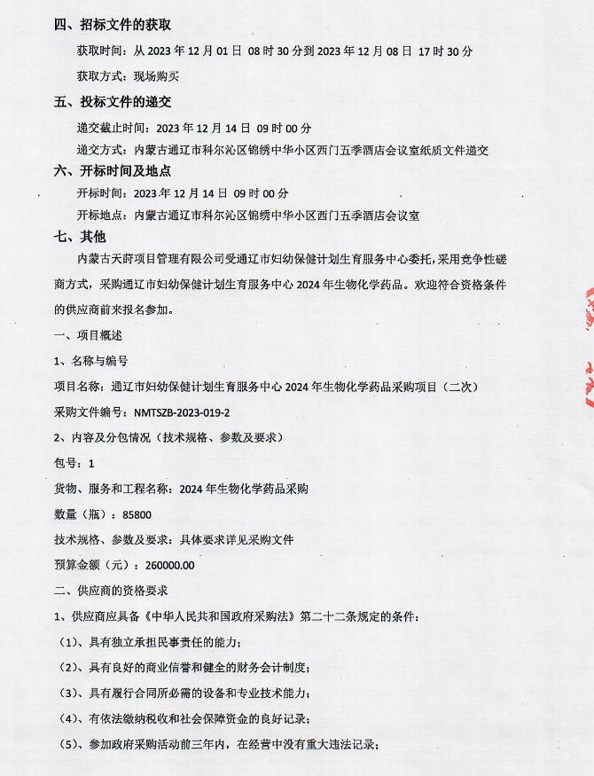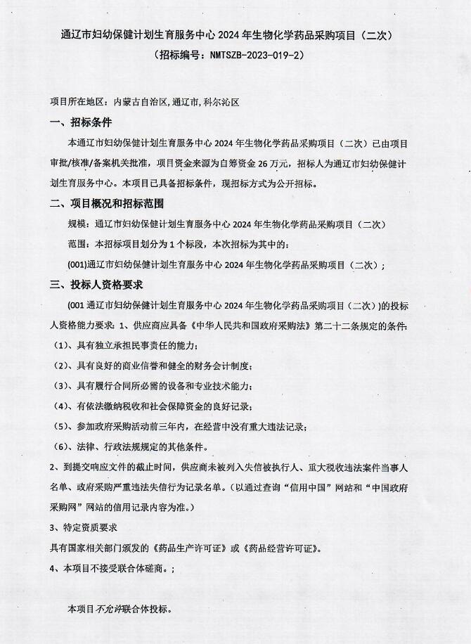 【通辽市妇幼保健计划生育服务中心】内蒙古自治区通辽市妇幼保健计划生育服务中心2024年生物化学药品采购项目(二次)