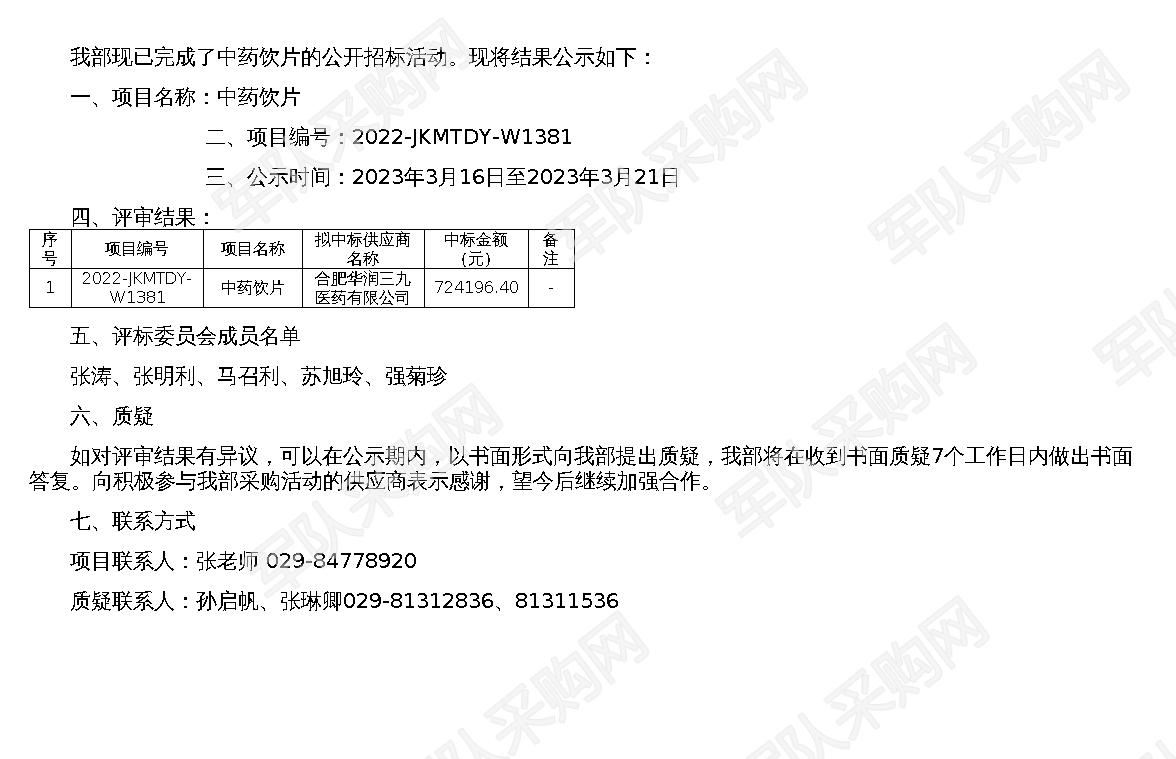【军队采购】军队采购网中药饮片招标结果公示(2022-JKMTDY-W1381)