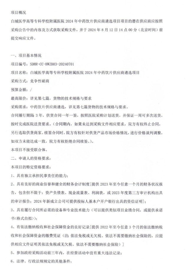 【白城医学高等专科学校附属医院】吉林省白城医学高等专科学校附属医院2024年中药饮片供应商遴选项目竞争性磋商公告(二次)