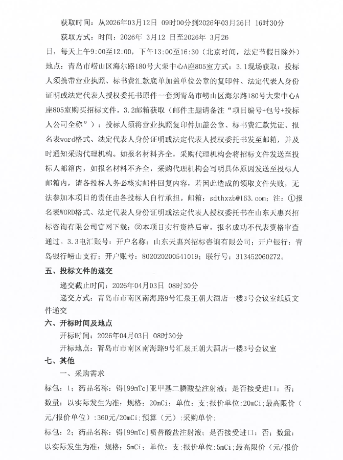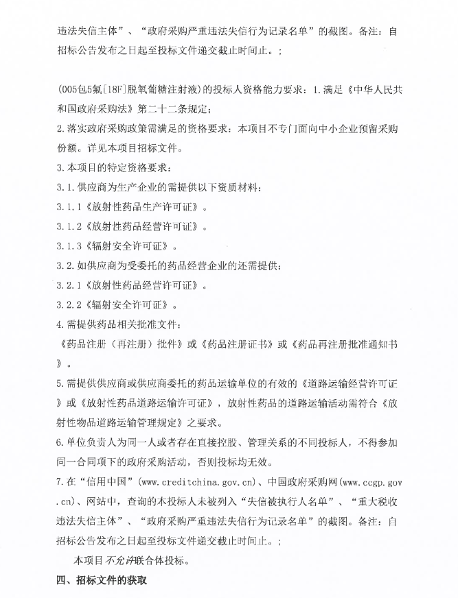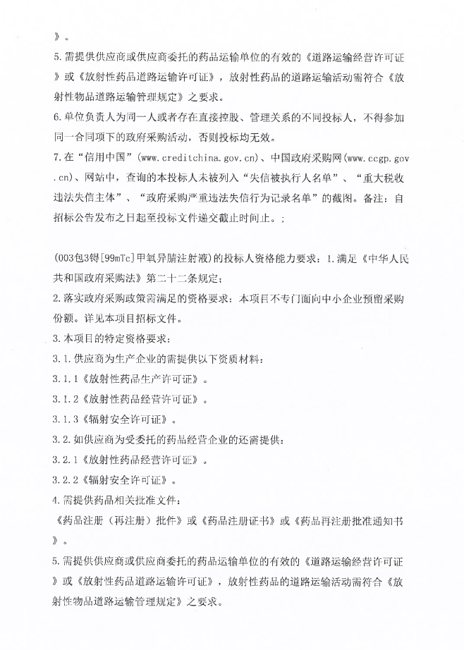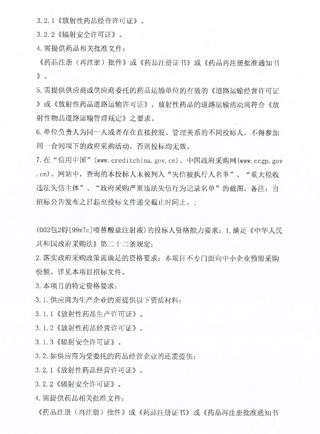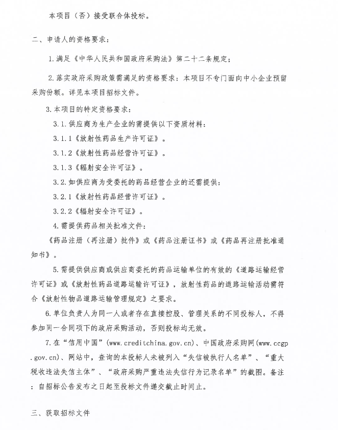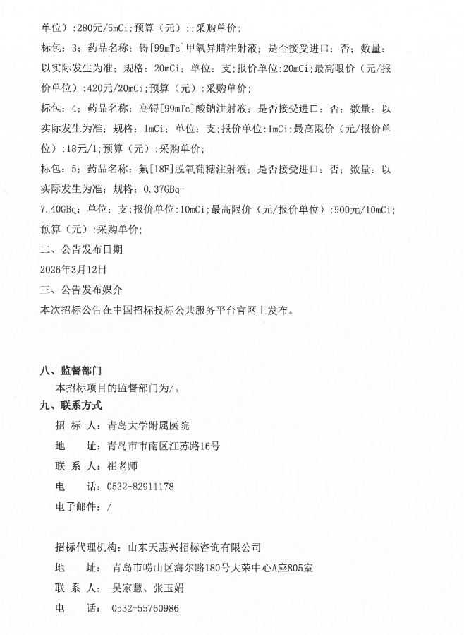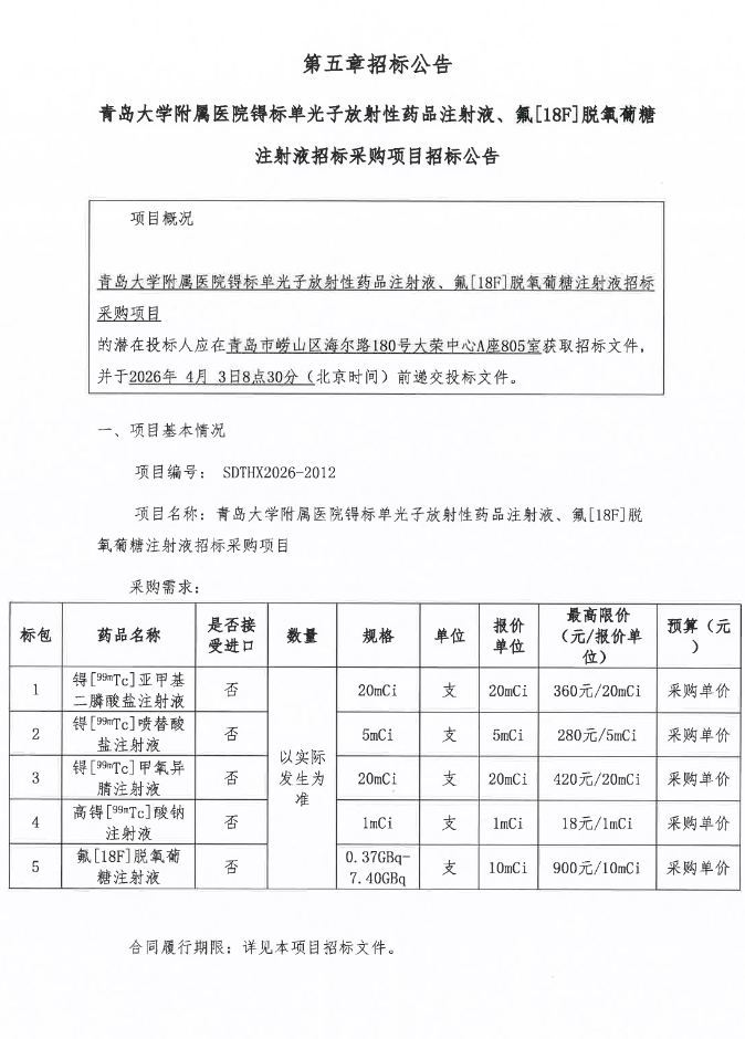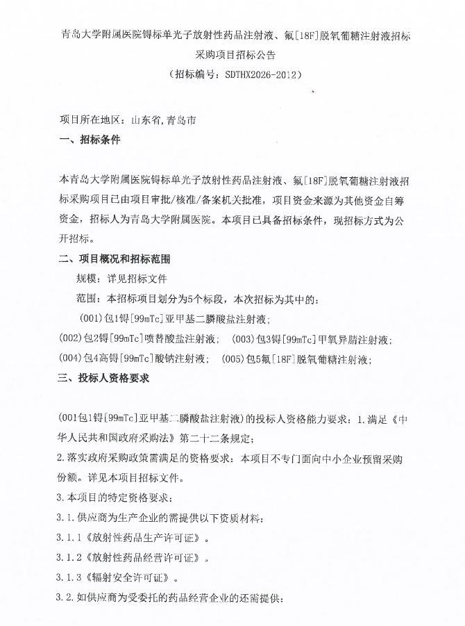【青岛大学附属医院】山东省青岛大学附属医院锝标单光子放射性药品注射液、氟[18F]脱氧葡糖注射液招标采购项目招标公告